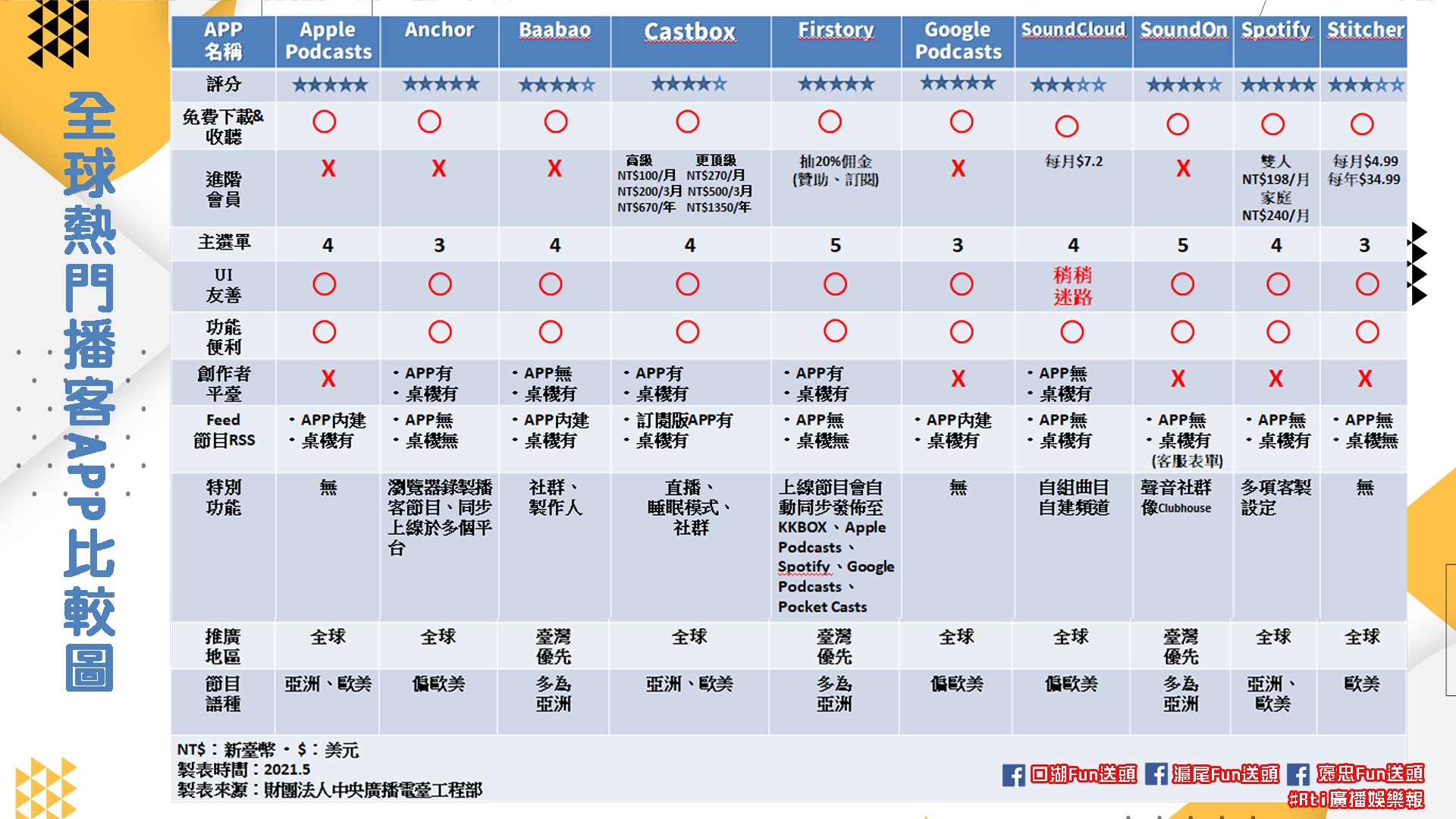 以整體項目方面,我以使用者的UI友善介面、費用便宜、功能便利、特別功能等項目作評選。若備有創作者平台且可同步發布到其他平台是更加分。所以,給了五顆星的 Podcast App 有 Apple Podcasts、Anchor、 Firstory、 Google Podcasts、Spotify。