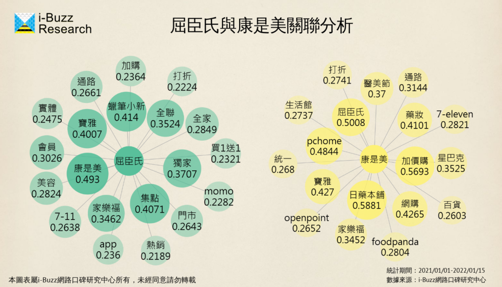 最後,i-Buzz透過關聯分析觀察四家藥妝店的關聯詞,發現四家品牌各有特色。觀察小三美日的關聯分析,可看到以生活用品類為最大宗,其次是美妝美髮,以及食品。在以保養品為主的藥妝店中,小三美日的商品顯得獨樹一格,原因是小三美日的臉書粉專很用心地介紹各項商品,常常分享像是口罩精油扣、濕紙巾、衛生棉、洗衣膠囊等等民眾所需的生活用品,大量的產品介紹為其累積了一定聲量。有些商品介紹也充滿創意,讓粉絲主動分享,例如防水膠、爆米花機等。