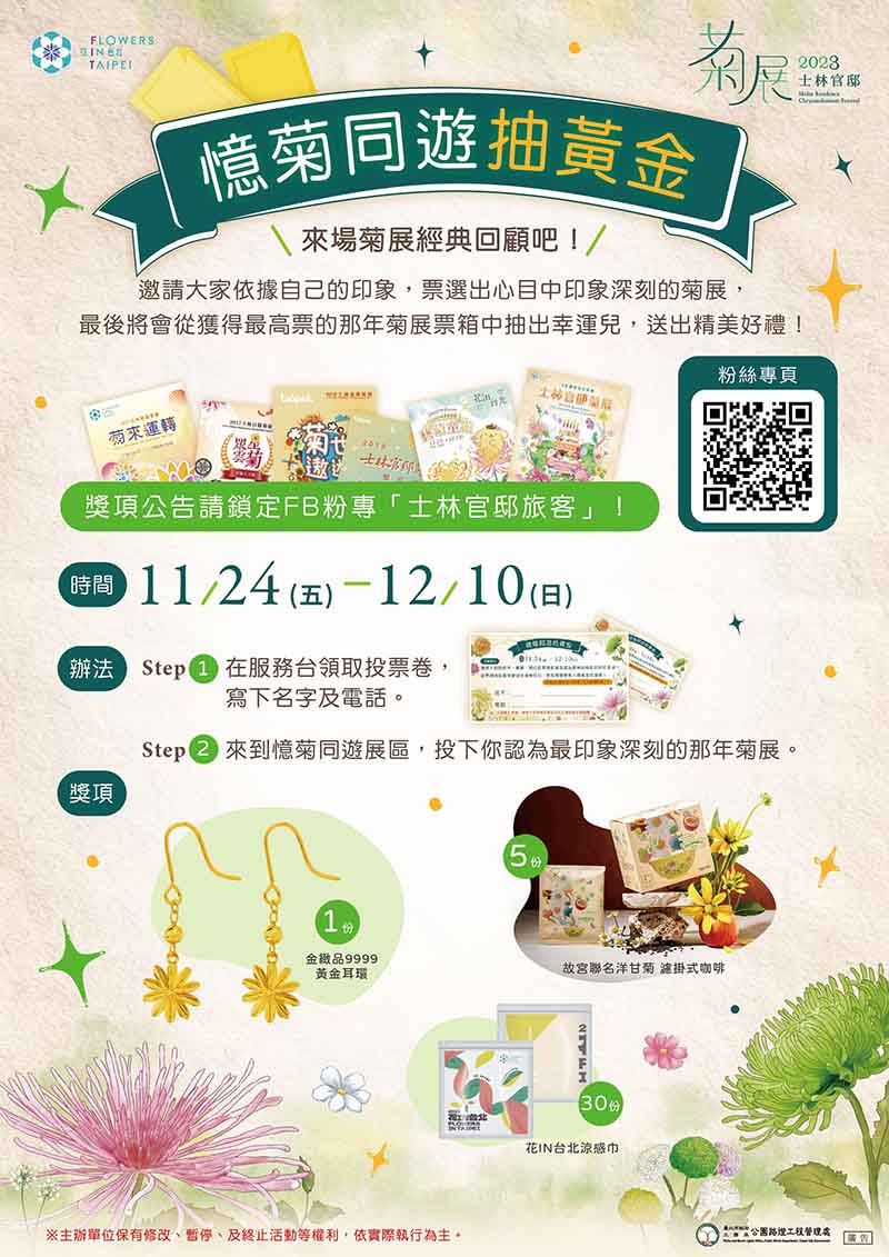 園藝管理所補充,菊展期間也別錯過獨家優惠,只要前往今年度特約店家消費出示與菊展官網優惠憑證,就可以享有多重優惠,若是有到士林商圈夜市消費的民眾,在菊展服務台出示與店家合影照片,還有精美好禮送給大家!展區活動「憶菊同遊抽黃金」在蔣夫人座車旁設計21年有成牆面,於各年份前放置投票箱,大家可以依據自己的印象票選出自己心目中最有記憶點的菊展,一起來菊展回顧經典,更有機會抽黃金耳環等獎品,歡迎您至服務台索取投票券;此外,「菊然是這樣!?」戶外實境解謎活動,結合現場實地景物及歷史文化,透過遊戲的解謎過程,穿梭在官邸道路間,找尋線索推理真相,跟著實境遊戲的故事脈絡,了解有關菊展的園藝知識、藝術精神、文化歷史,除了解謎的快感,還能踏訪你不曾注意到的景點,完成任務後還可至服務台領取限量好禮,歡迎您踴躍參與!