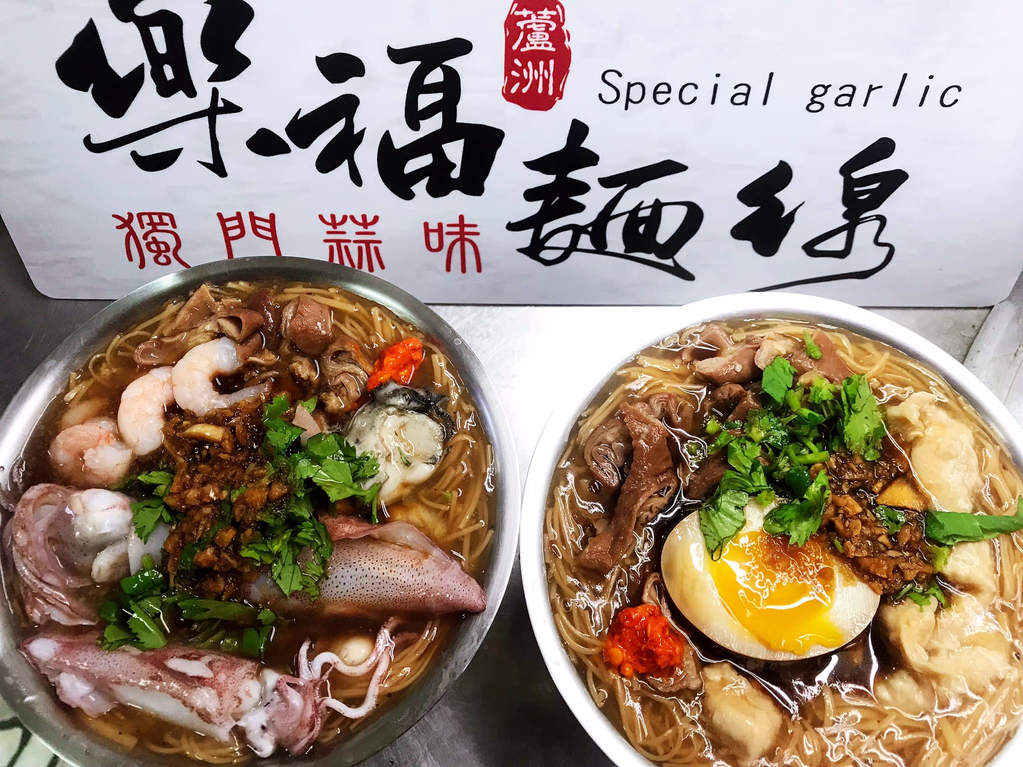 加雞丁的麵線你吃過嗎?隱身在蘆洲長安街永康公園旁的樂福麵線,是老饕才知道的在地美食。除了堅持使用成本高三分之一,口感更為Q彈的純手工麵線外,最靈魂的獨門蒜醬、湯頭更是下了許多功夫,店裡有傳統的大腸、蚵仔麵線選擇外,還有極罕見的雞丁及素食口味等,每天新鮮現煮,假日經常需要排隊才吃得到。