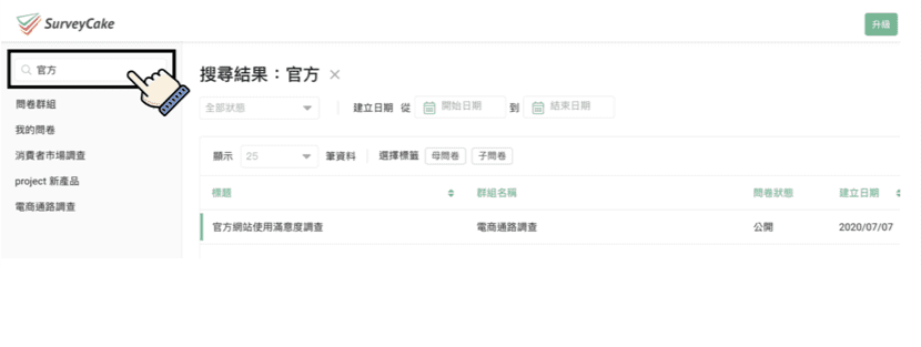 SurveyCake 「搜尋」功能支援跨群組查詢,只要輸入特定關鍵字,系統就會自動顯示內含該關鍵字的問卷標題,方便你快速找到想要的問卷。