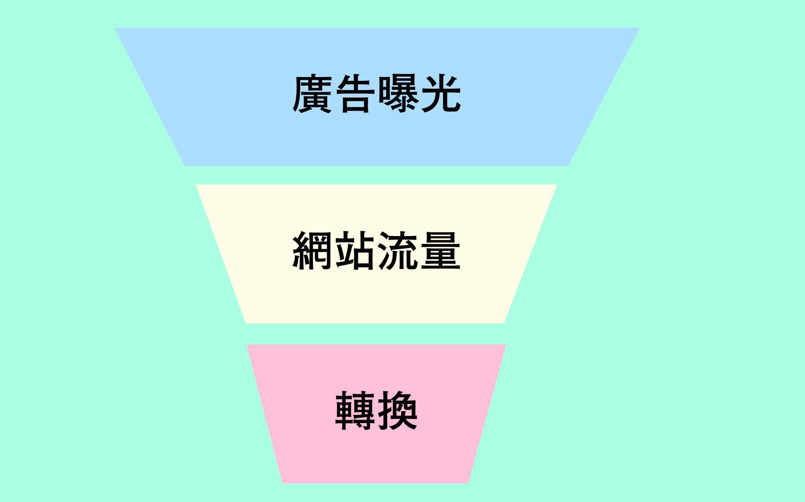 我們試加入一些數字在圖內,你便可看見會形成一個漏斗形狀。當你有這圖就可以清𥇦看見,廣告曝光後沒有回報,那個位置問題。