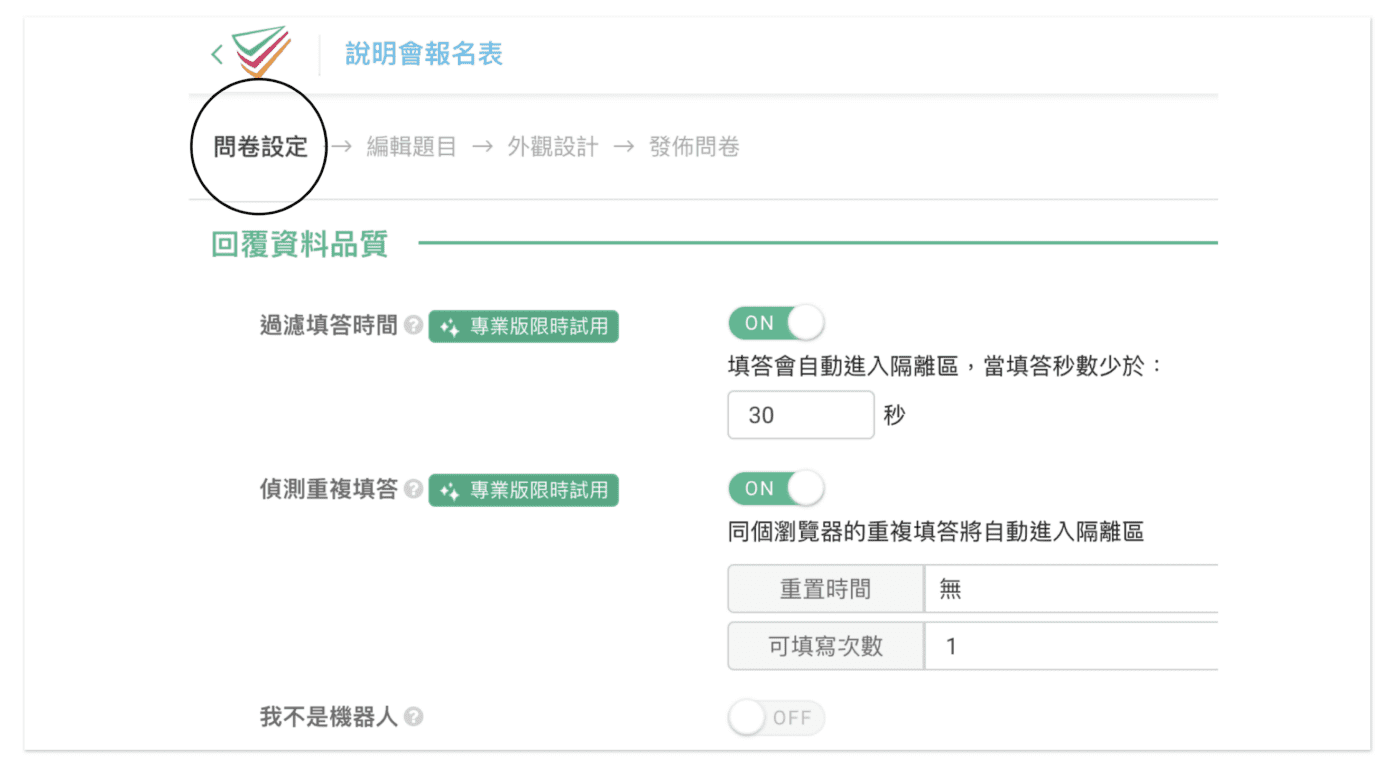 想要排除這些無效填答,你不需要親自手動檢查,只要利用 SurveyCake 「不重複」、「我不是機器人」與「隔離區」功能,就能有效確保你的表單回覆品質囉!