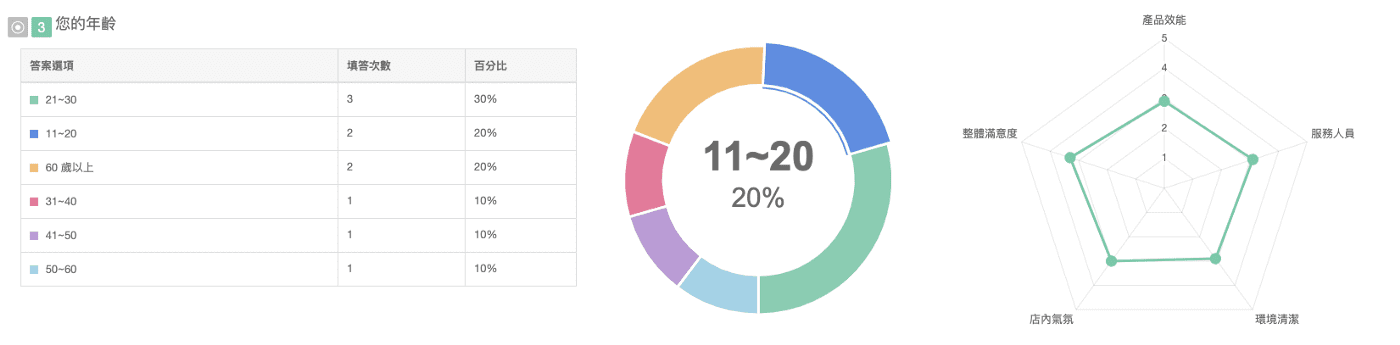 活動結束後會蒐集使用者回饋,作為往後舉辦活動的參考, SurveyCake 後台會自動針對滿意度回饋進行數據分析及製作統計圖表(圓餅圖、長條圖、雷達圖、常態分布圖)。