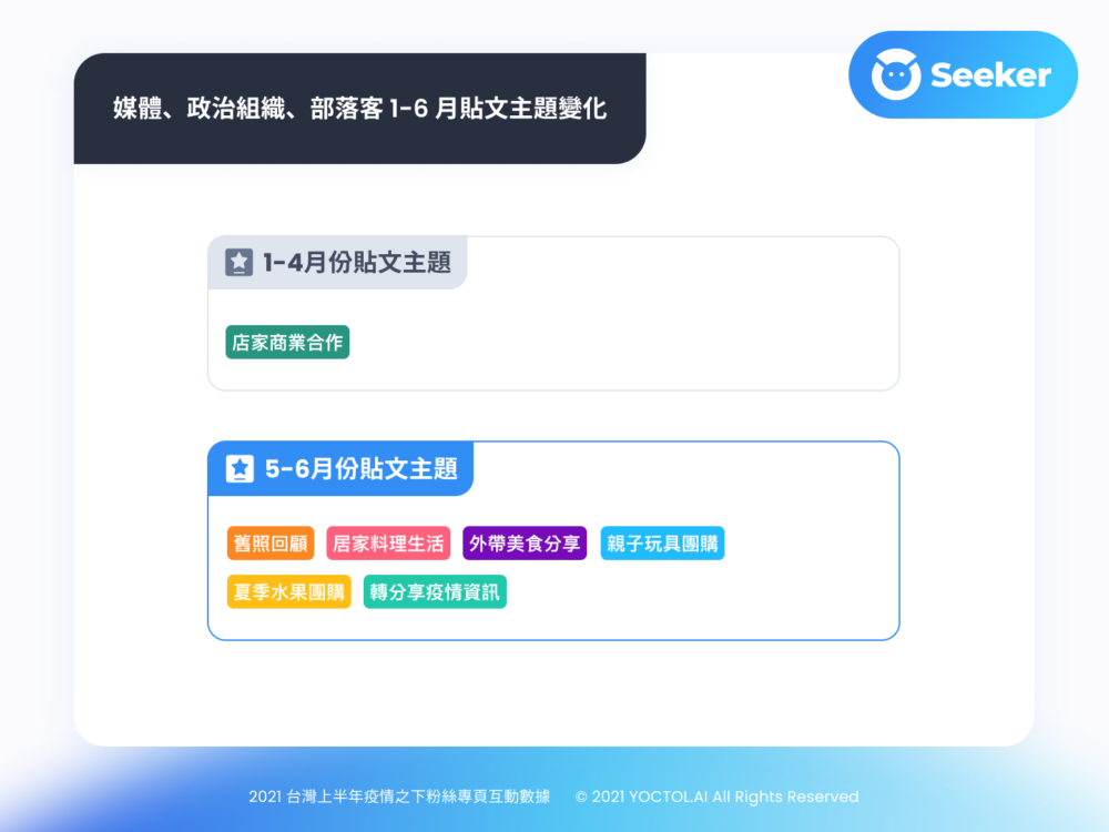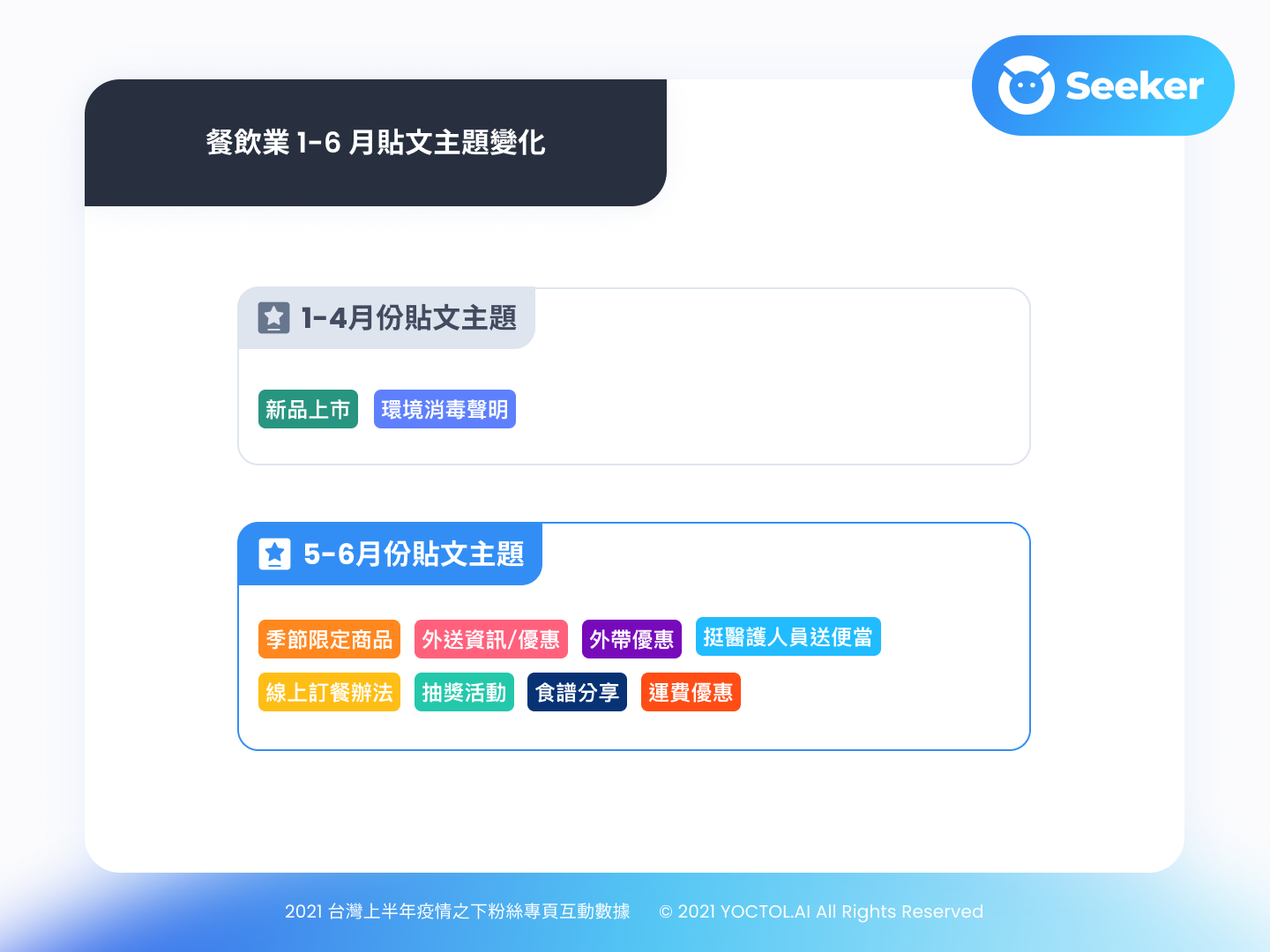 Seeker 觀察使用者的「貼文主題」由「新品資訊」大量轉為「外送服務」、「外帶優惠」,顯示餐飲業利用 Facebook 粉專作為主力行銷平台。此外,更有小編急中生智,利用創意貼文結合「食譜分享」、「心理測驗」等文章吸引粉絲,藉機培養黏著度並導購。