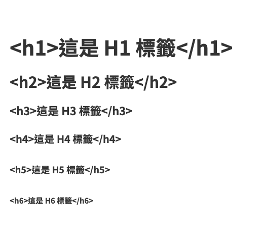 文章或頁面中可能會有許多標題,這些標題層級,會依照重要程度,在 HTML 程式碼中被排序為:Heading 1、Heading 2 等 .. 排序到 Heading 6 標籤,簡稱為:H1 至 H6。