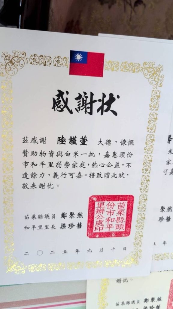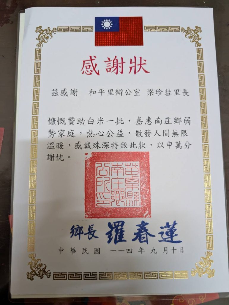 此次捐助不僅惠及頭份市和平里,也特別將關懷延伸至南庄鄉的偏鄉弱勢家庭。對於交通不便、資源有限的山區居民而言,這份物資不只是生活補給,更是一份社會溫暖。