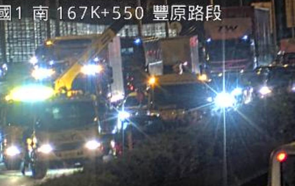 國道1號豐原路段聯結車撞護欄造成車流回堵二公里。翻攝畫面