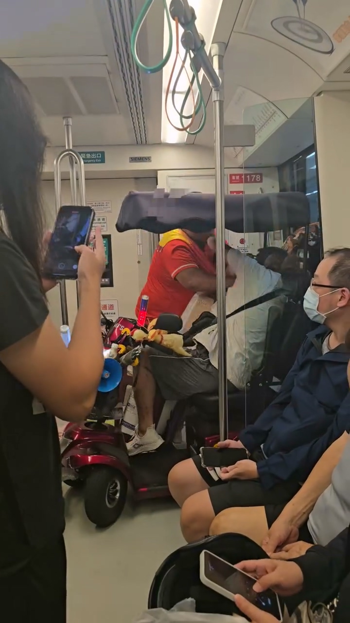高雄捷運發生打架事件,男子行動不便騎乘電動代步車,因下車動線遭阻擋,因而出言告知橘衣男子,該男子疑似不滿態度導致口角糾紛,並且動手推人。