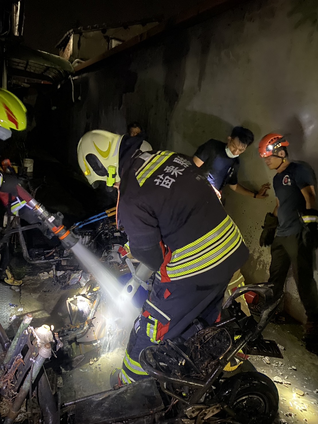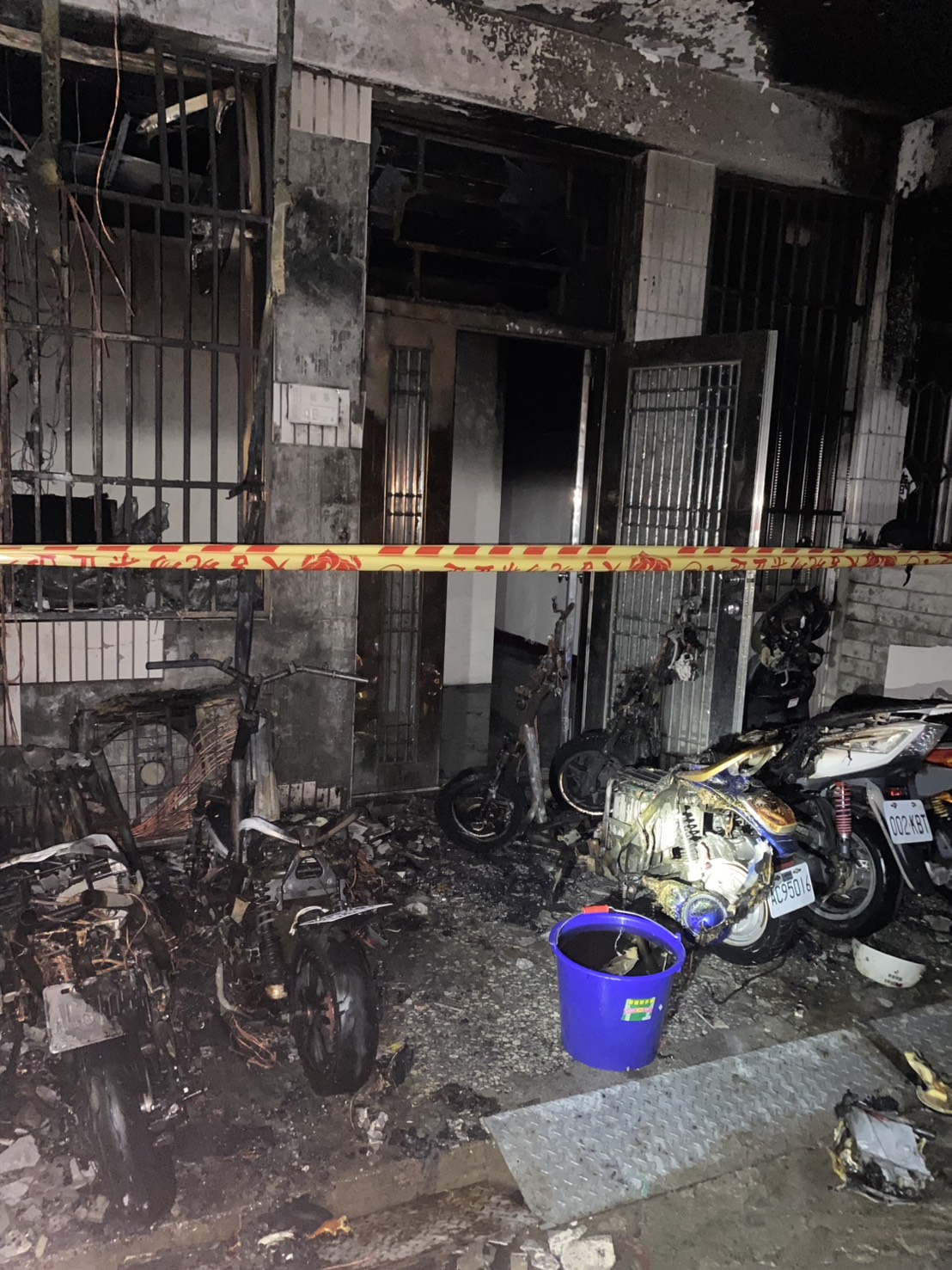 消防隊員清理火場發現,3台電動機車全毀、2台125CC機車半毀,詳細起火原因還待調查鑑定。