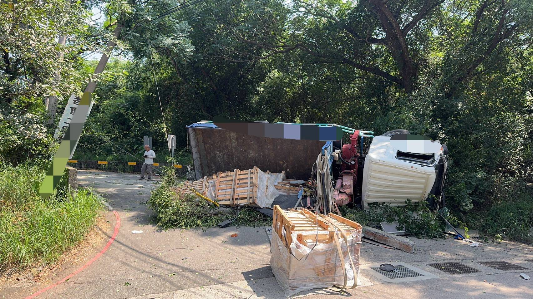 台中沙鹿區大貨車撞電桿側翻。翻攝畫面