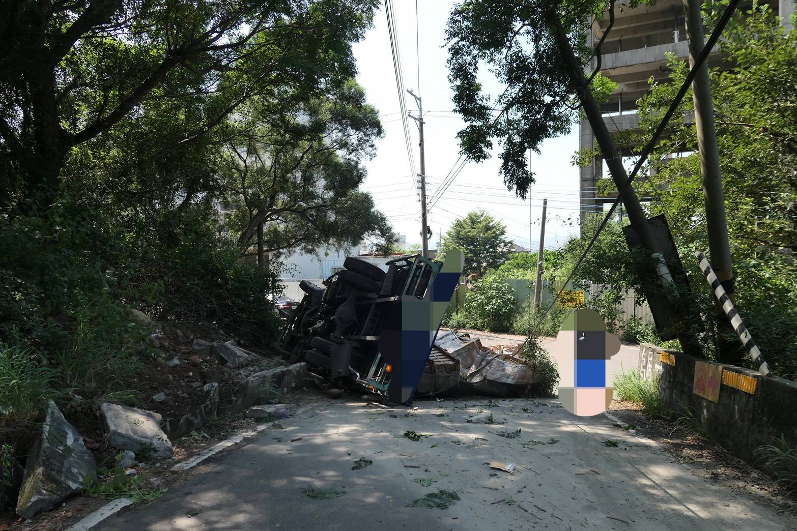 沙鹿大貨車煞車失靈撞電線桿側翻。翻攝畫面