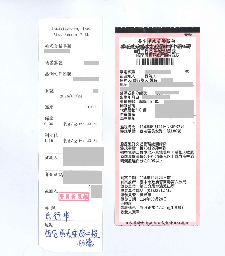 接著9月24日深夜,54歲洪姓男子在中清西二街紅燈左轉被攔檢,同樣渾身酒氣,酒測值竟高達1.15mg/L,連他自己都嚇到,警方立刻開單告發。