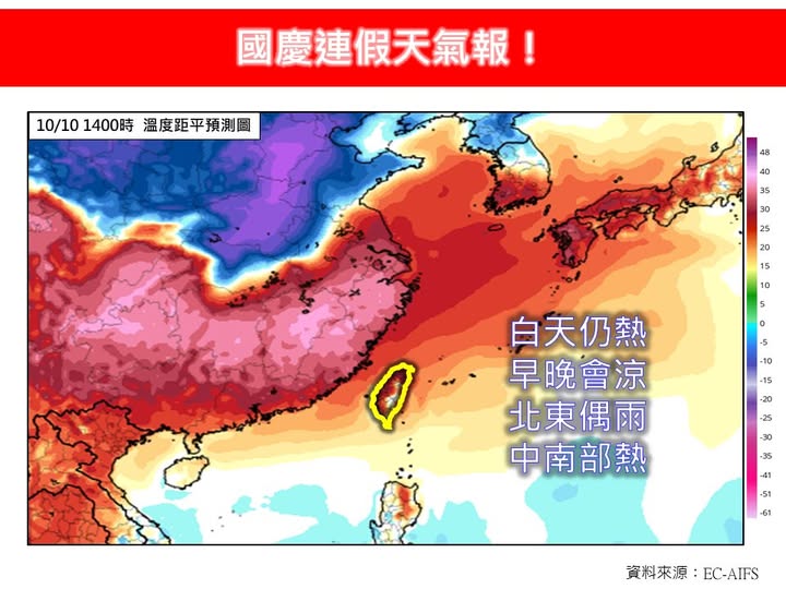 國慶連假熱力登場!中南部飆35度 午後雷陣雨突襲記得帶傘.(圖/翻攝 林老師氣象站 臉書)