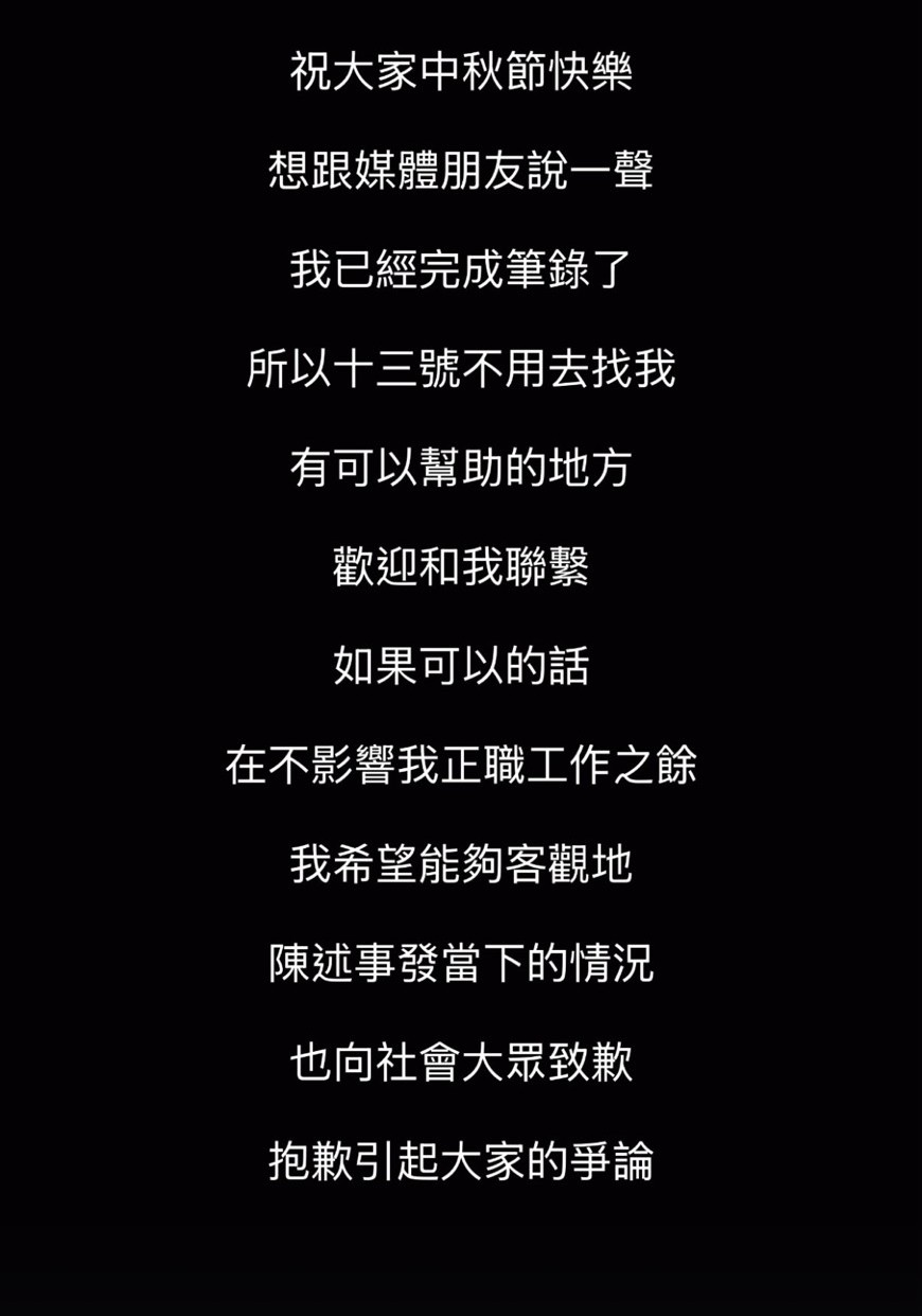 這名台大高材生在IG發現時動態表示,「想跟媒體朋友說一聲,我已經完成筆錄了,所以13號不用去找我」,他也說「如果可以的話,在不影響正職工作之餘,我希望能客觀地陳述當下的情況。」最後他表示「也向社會大眾致歉,抱歉引起大家的爭論。」