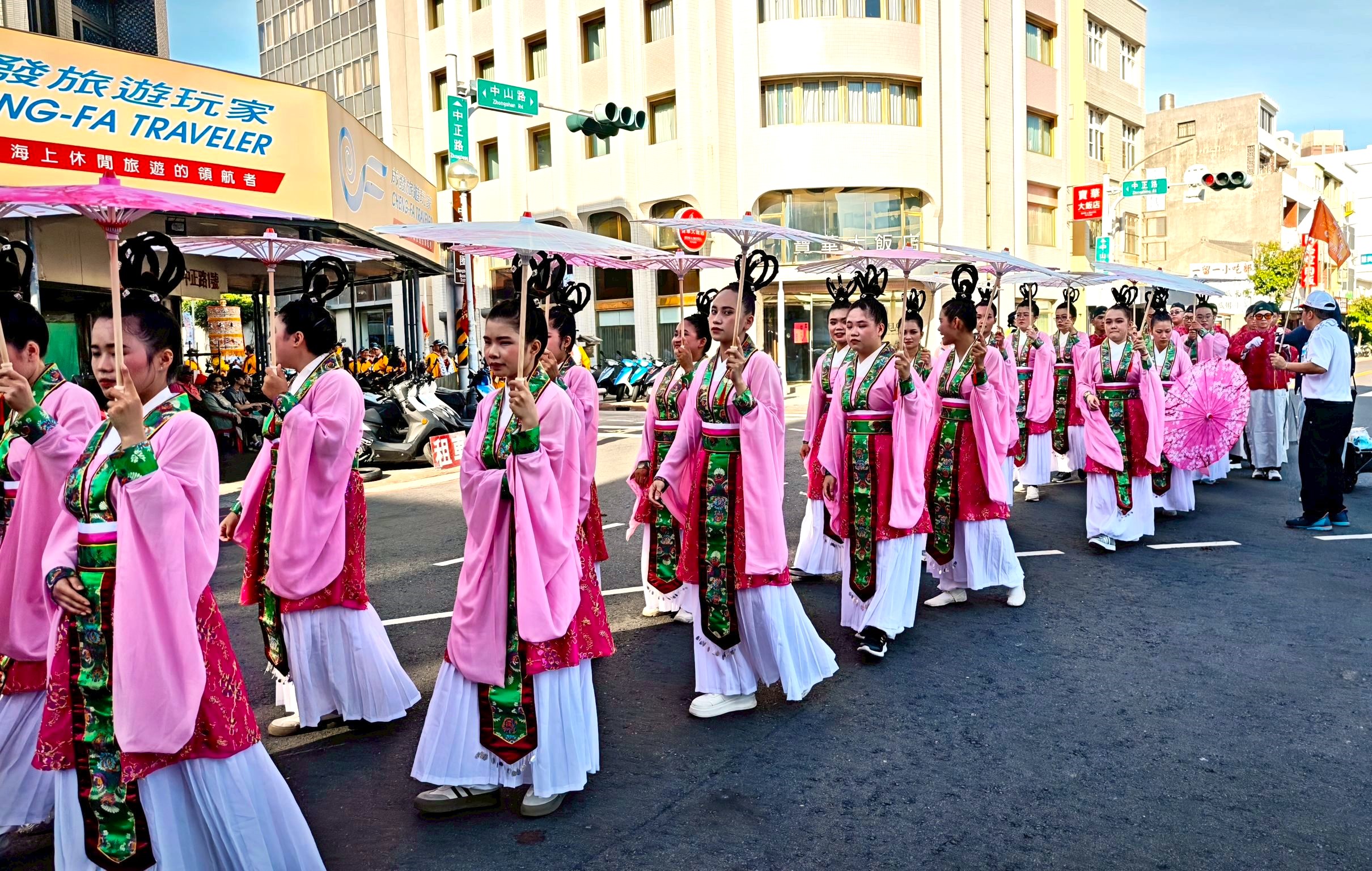 遠從越南及印尼籍前來就讀學生,能更加深入台灣的習俗與宗教文化,吳鳳科大國內學生與外籍學生(越南籍與印尼籍)共同身著傳統服飾參與遶境,女學生身穿六佾舞服,舞姿典雅,展現古風之美;男學生則著漢服,儒雅風采盡顯。此一文化融合畫面不僅彰顯吳鳳科大推動國際教育的成果,更獲得現場民眾高度讚賞與熱烈迴響。