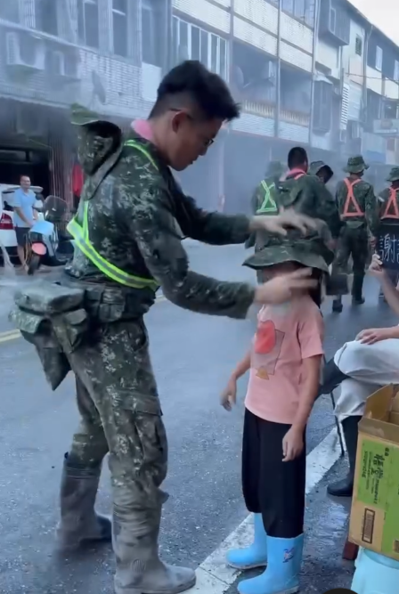 【賴傳媒、記者爆料網 陳欣妤/綜合報導】花蓮光復洪災至今已超過兩星期,不過湧入許多「鏟子超人」志工協助當地居民清淤等災後重建工作,國軍也投入救災行列,近日更有一段超暖心影片在網路流傳,一名小女孩站在路邊,比出愛心手勢迎接國軍隊伍,其中一名國軍把自己的迷彩漁夫帽,戴在小女孩頭上,送給小女孩,目擊民眾紛紛鼓掌歡呼,而這名國軍也親上網路說明送帽子給小女孩的原因。