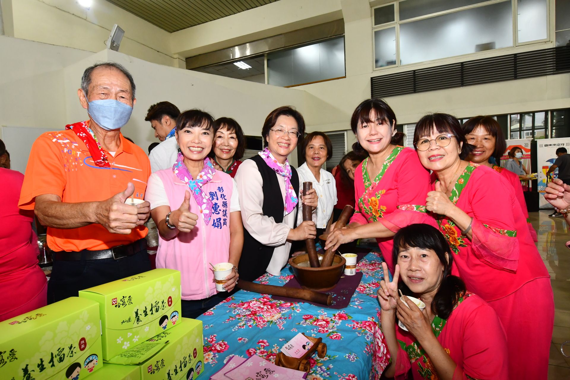 圖說:王惠美開心的學習客家傳統搗麻糬及擂茶製作方法