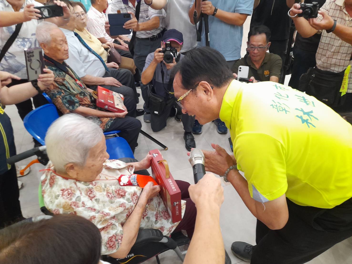 圖說:林世賢親自送金項鍊、紅包禮物給百歲人瑞,提前祝重陽快樂