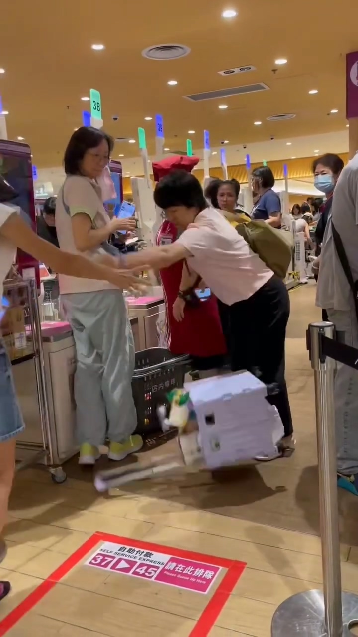 一段在香港康怡AEON超市的影片在網路上瘋傳,畫面中兩名女子疑似因為排隊問題起爭執,其中一名短髮阿姨先動手,把後方戴帽女的購物車整個「掀翻」,引發推擠衝突。不過現場的店員似乎偏向勸「後出手」的一方,短髮阿姨最後自己離開現場,整件事也在網路上掀起熱議。