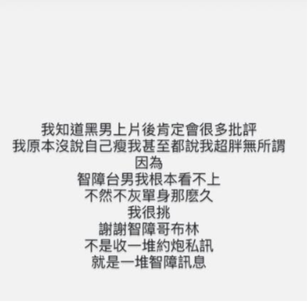 女方事後在IG發文說,我知道黑男上片後肯定會很多批評,我原本沒說自己瘦我甚至都說我超胖無所謂,因為智障台男我根本看不上,不然不灰單身那麽久,我很挑,謝謝智障哥布林,不是收一堆約炮私訊,就是一堆智障訊息。