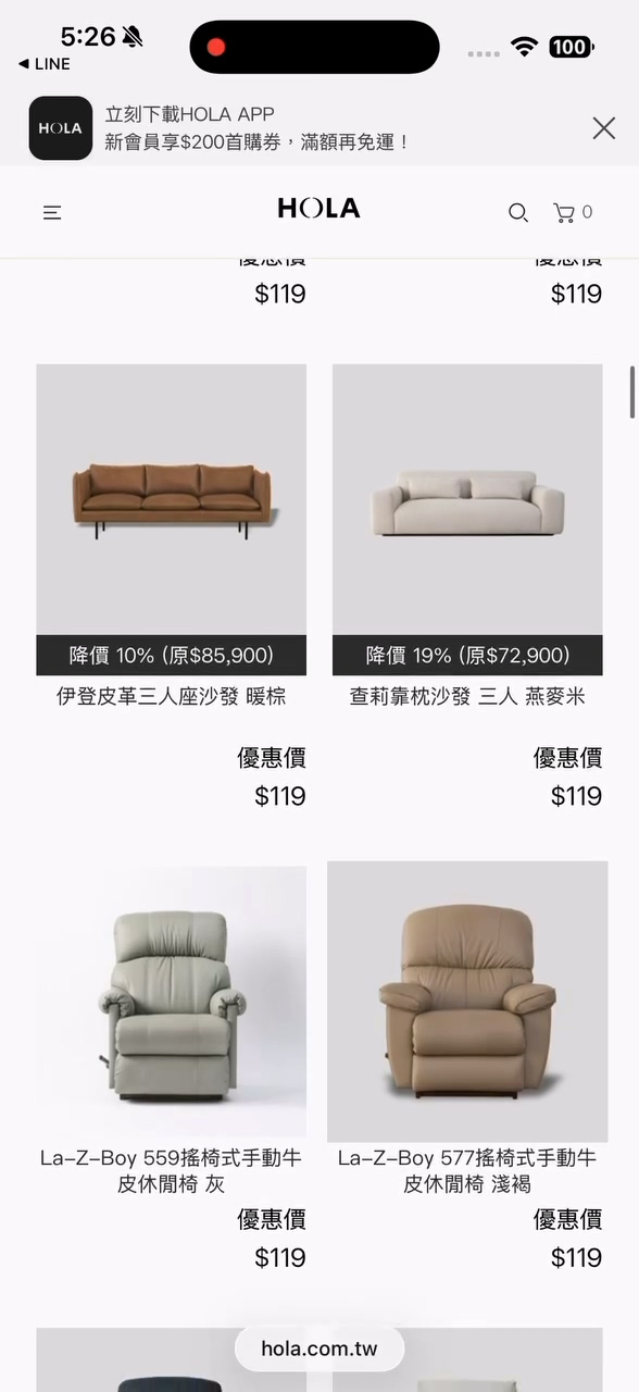 多名網友在Threads發文指出,HOLA疑似標錯價,Lazyboy等進口沙發官網顯示只要119,不少網友有下單。隨後官網暫時關閉,進行系統優化調整,目前全部價格已經恢復原本的售價。