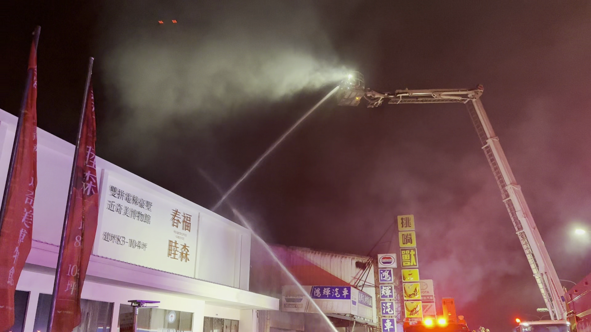 而緊鄰的團購倉庫,由於內部堆放許多易燃物,造成二樓全面燃燒,火光竄出鐵皮,估計二樓物品均無法復原也無法販賣,業者恐怕損失慘重。
