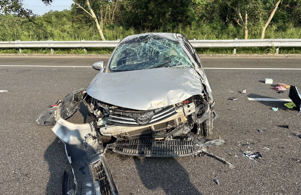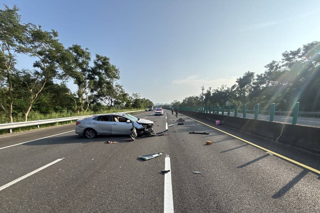 員警到場發現,該輛自小客車車頭嚴重毀損、擋風玻璃碎裂,駕駛並未受傷、無酒駕,自述因為未注意前方路況而肇事。警方連絡拖吊車到場將該車拖離,恢復正常通行,後續由國道警察八大隊調查處理中。