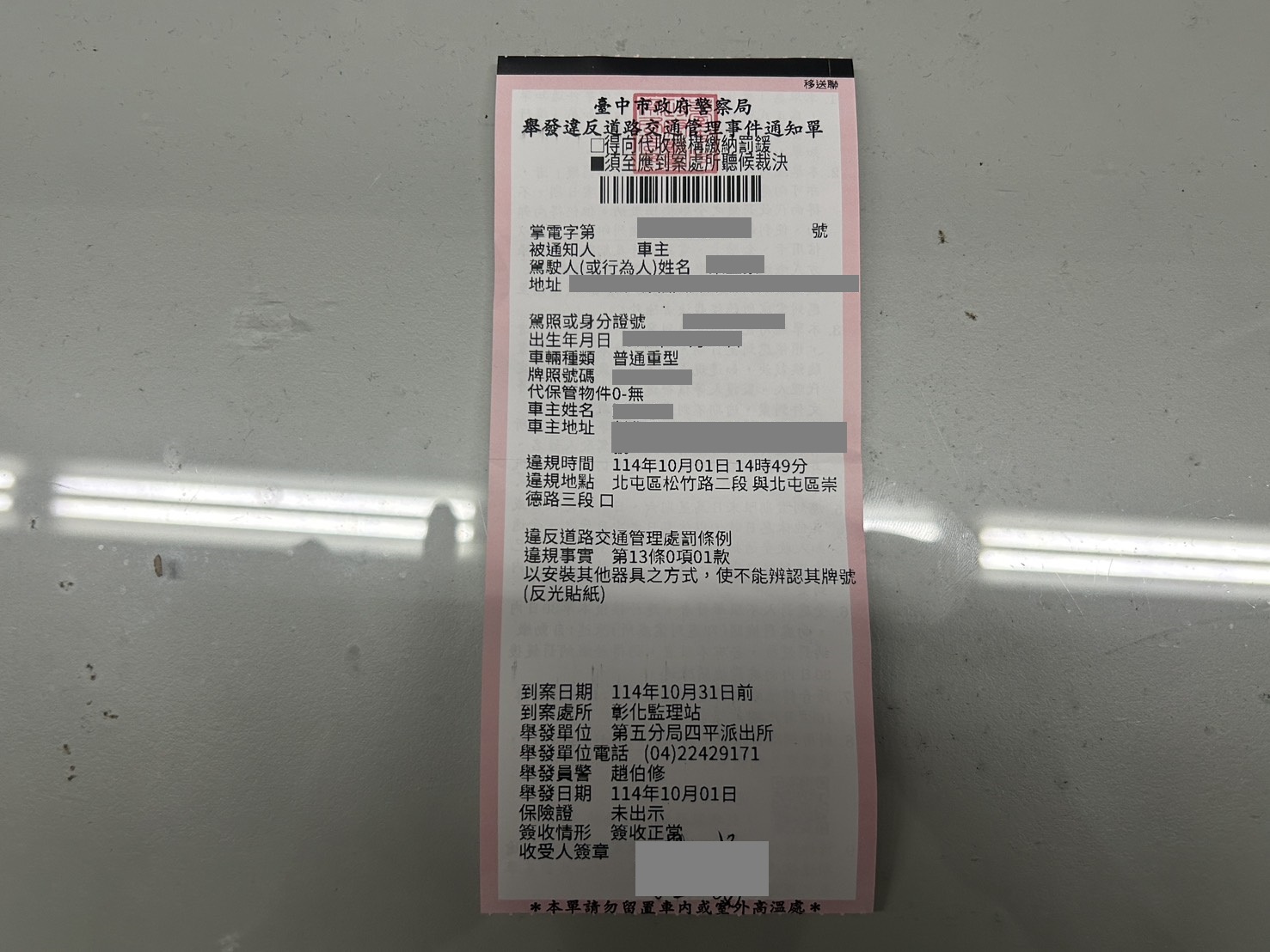 梁姓男子(37歲)當下搞不清楚警察為什麼叫住他,員警告之「車牌上面的反光貼紙遮住了牌號,導致牌號無法清楚完整辨認,明顯違反規定」,梁男說機車是家屬的,不清楚為什麼會貼這樣的貼紙,然而違規事實明確,員警依規定舉發。