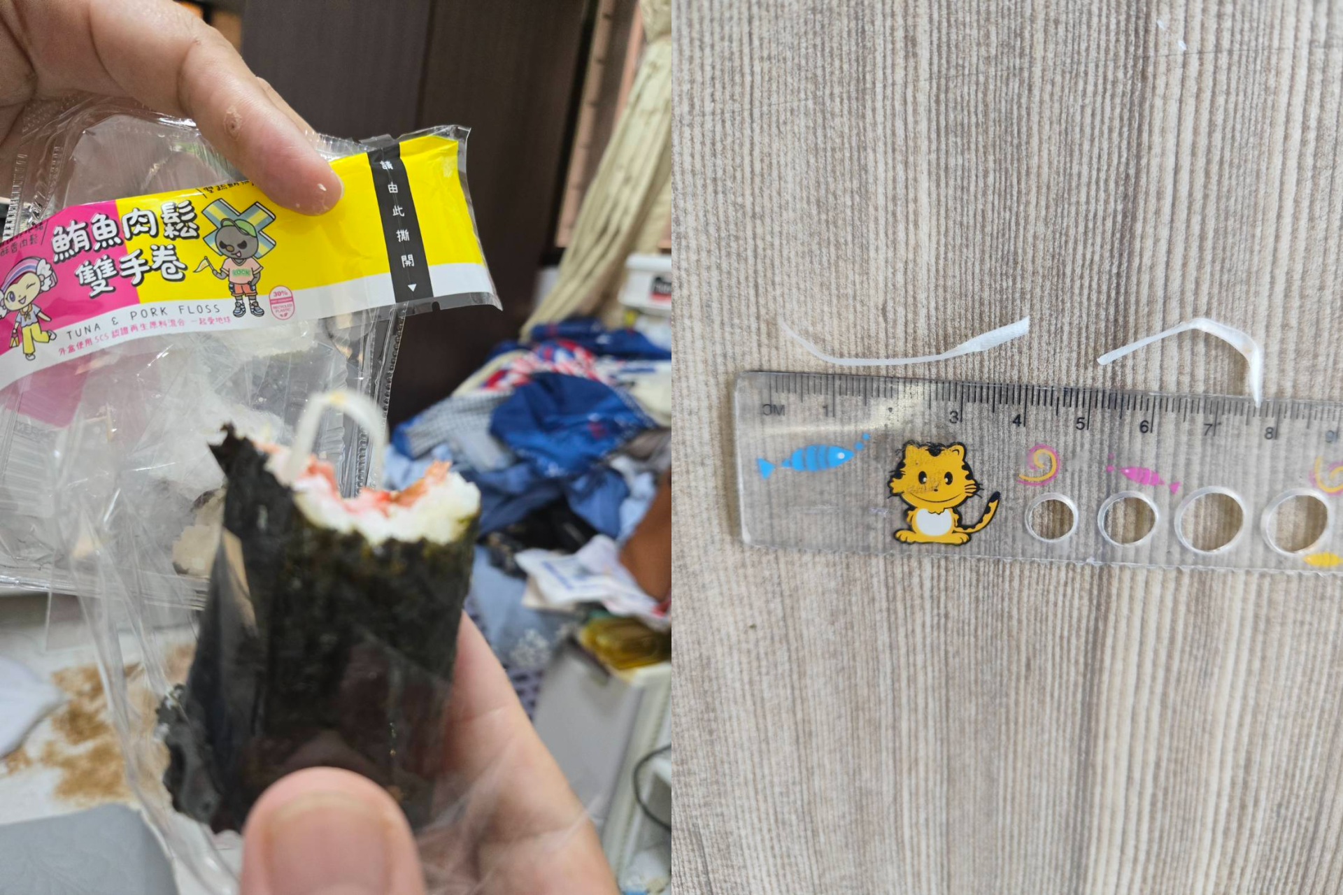 民眾控訴食用7-11「手卷」吞入8公分帶倒鉤塑膠條險喪命。爆料人提供