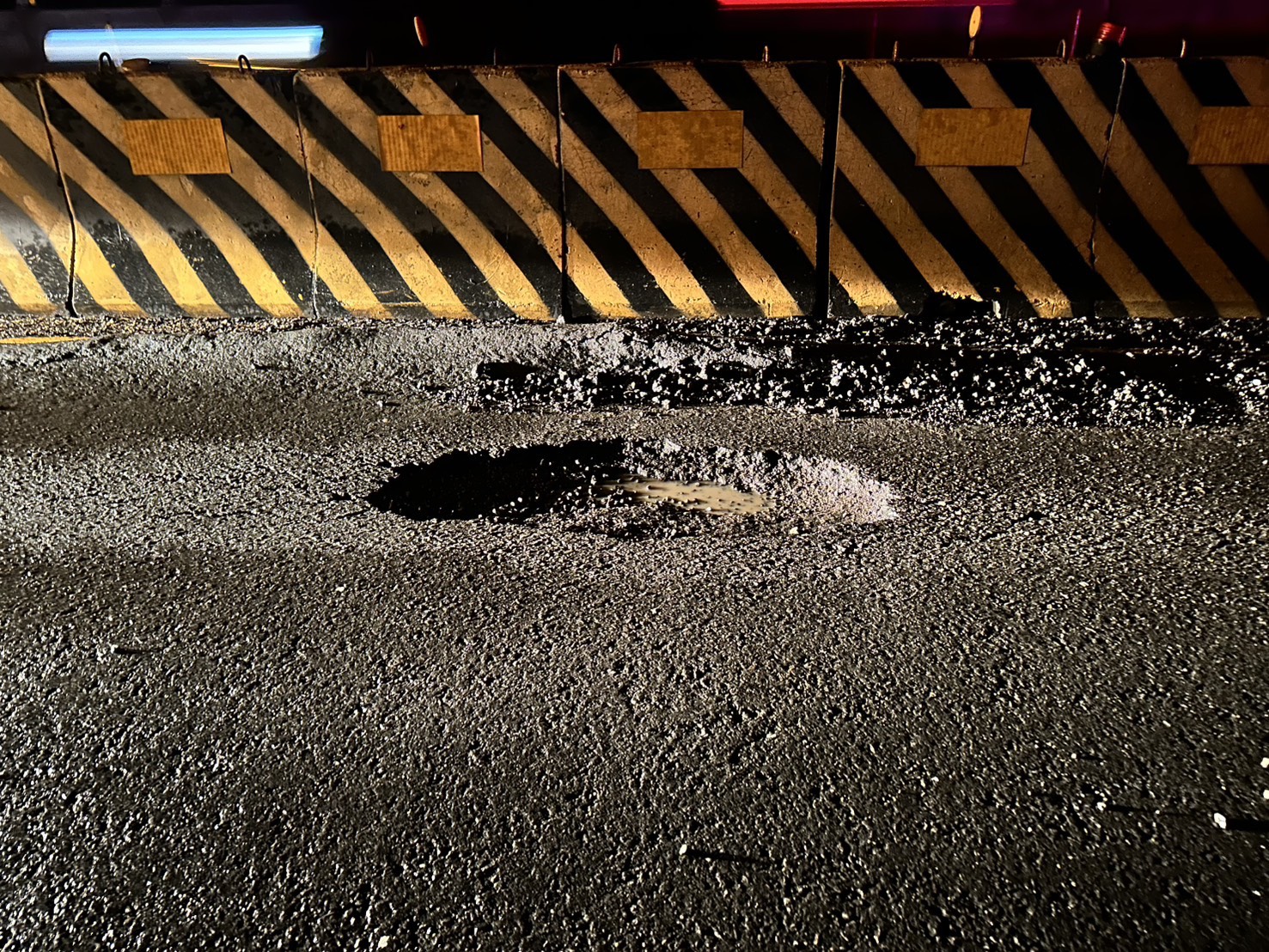 【Lai傳媒、記者爆料網/周庭慶/苗栗報導】苗栗縣竹南警分局中港海口派出所昨(22)日18時許接獲報案,西濱快速道路北上路段有多輛車輛爆胎。員警到場後查知,西濱北上94.5公里處外側車道與內側車道匯入處路面出現大坑洞,導致共有五部自小客車行經時爆胎受損。