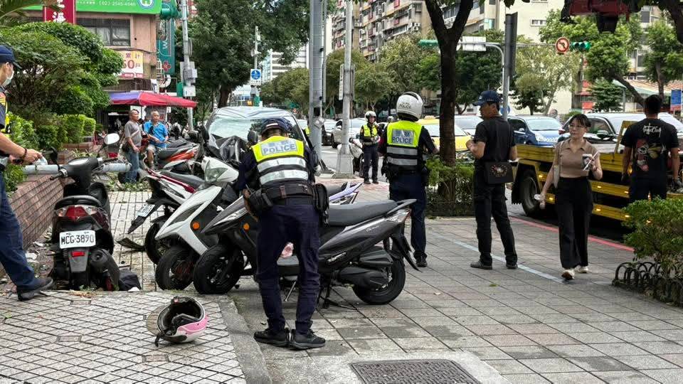 民權東路自小貨車開上人行道撞倒5輛機車造成2人受傷送醫。翻攝畫面