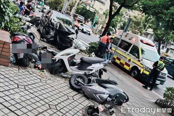 民權東路自小貨車開上人行道撞倒5輛機車造成2人受傷送醫。翻攝畫面