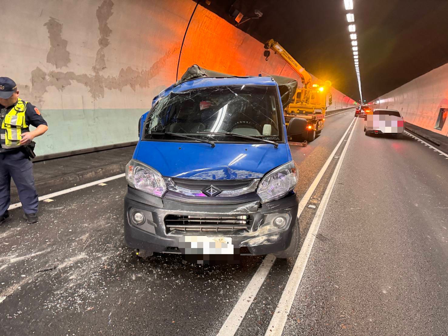 【lai傳媒、記者爆料網/周庭慶/宜蘭報導】國道5號雪山隧道內昨(3)日晚間發生一起事故!19時45分許,國道警察第九大隊接獲通報,國道5號北向20公里內側車道,小貨車疑似爆胎撞擊外側施工廊道,再失控擦撞內側牆後,橫向停在車道上。