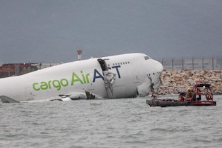 香港機場驚險凌晨!杜拜貨機衝出跑道墜海 2地勤殉職、4機組獲救.(圖/翻攝 香港01)