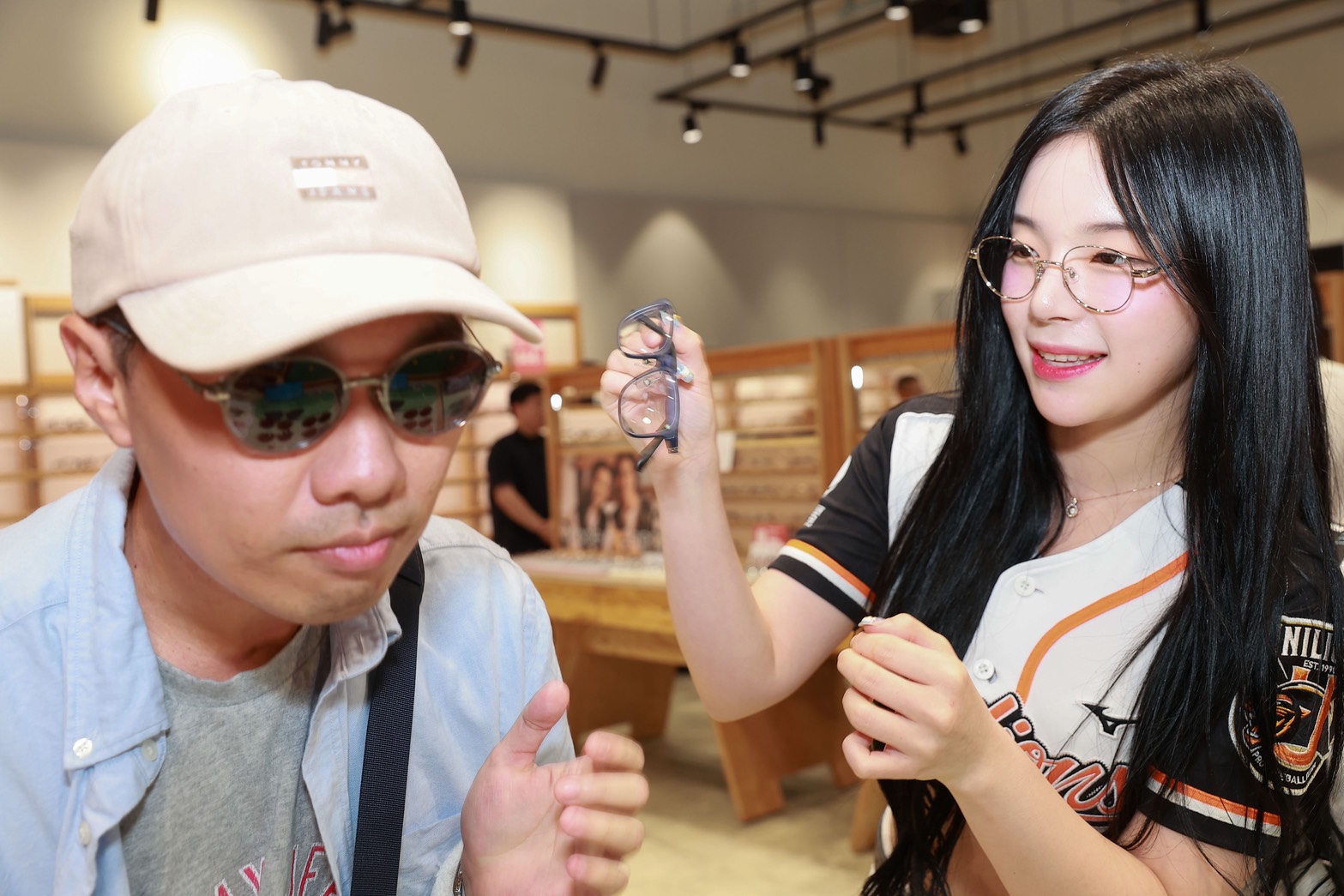Mimi 為一位熱情揮應援毛巾的粉絲挑選「JINS X 卡娜赫拉的小動物聯名眼鏡」系列,貼心示範如何一秒切換成太陽眼鏡;Yovia 則幫一位來自新竹的獅粉挑選「JINS 2025 日本製秋冬系列」鏡框,連粉絲的太太都在旁邊直誇非常適合。