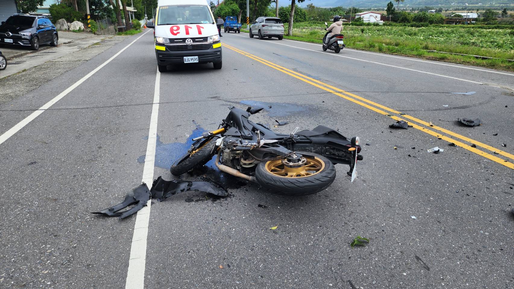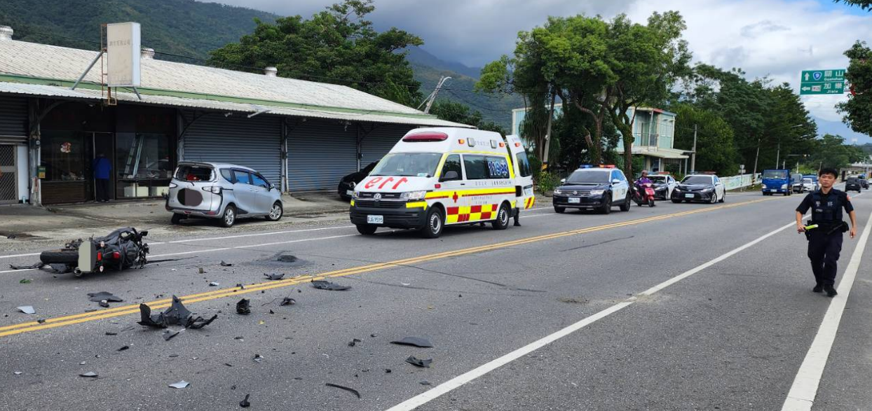 台東休旅車違規迴轉遭機車追撞現場一片凌亂。警消人員到場處理。翻攝畫面