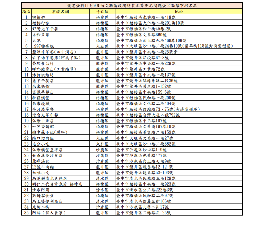 彰化文雅畜牧場遭移動管制期間竟還流出4萬顆違規雞蛋,台中梧棲區龍忠蛋行更被查到,11月9日從文雅畜牧場進貨約4000台斤籃蛋。台中市府公布龍忠蛋行11月9日向文雅畜牧場進貨之芬普尼問題蛋品35家下游名單。