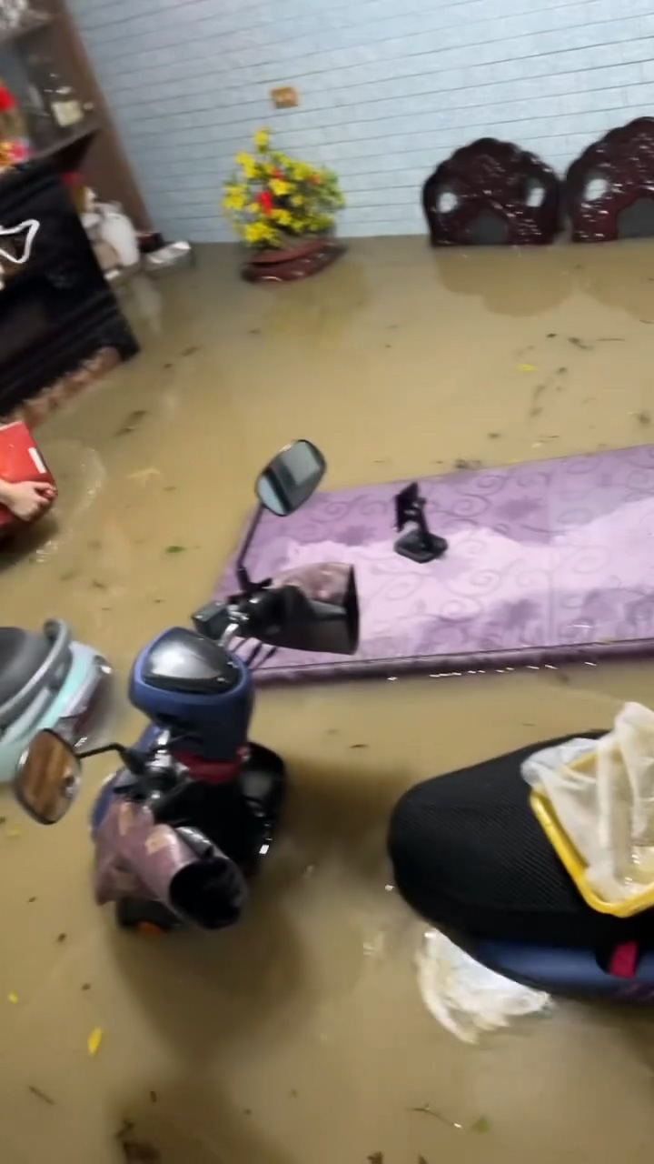 多名網友在Threads分享宜蘭蘇澳的慘況,水淹到市區,全聯旁的變電箱爆炸起火,一樓幾乎滅頂。停在室內的機車也泡水,整個坐墊都被淹過。