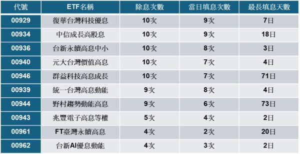 至於部分ETF雖最終完成填息,但速度相對偏慢。群益科技高息成長(00946)與野村趨勢動能高息最長填息天數分別高達71日與73日;FT臺灣永續高息(00961)也曾出現最長20日的填息紀錄。