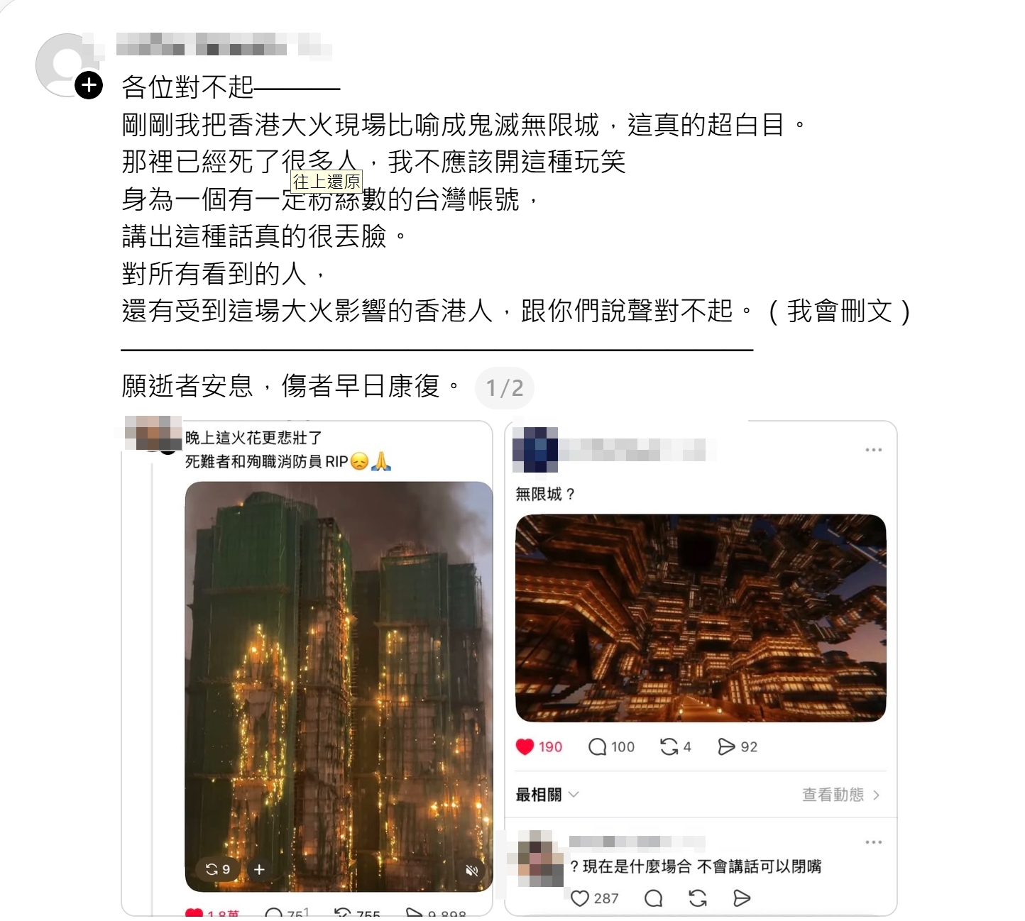 【Lai傳媒、記者爆料網/林千允/綜合報導】香港大埔宏福苑大火釀成65人死亡、70人受傷的重大傷亡,震驚各界,卻有台灣Threads粉專在災難照片下貼出《鬼滅之刃》畫面,戲稱像「無限城」,冷血發言瞬間點燃港網友怒火,也讓不少台灣網友看不下去。