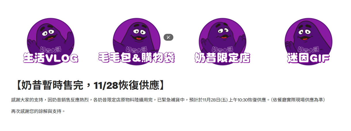 【Lai傳媒、記者爆料網/林千允/綜合報導】麥當勞「奶昔系列」自11月19日起於全台12家門市試賣,提供香草與草莓兩種口味,每杯嚐鮮價69元。沒想到熱潮太熱烈,開賣僅5天就全部售完,官方公告指出預計11月28日上午10:30恢復供應,想嘗鮮的民眾需留意餐廳現場狀況。