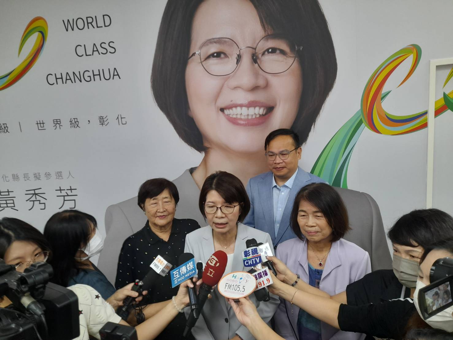 競辦成立揭牌,黃秀芳由兼任競辦總幹事的立委陳秀寶及前縣長周清玉、翁金珠、國策顧問賴博司、國策顧問何黎星、國策顧問陳永昌、中華民國工業區廠商聯合總會理事長許正雲、國際扶輪社3462地區前總監黃進霖、正常國家文化基金會董事長蔡世寅、彰化縣議會民進黨團總召李俊諭等各界代表陪同揭牌。
