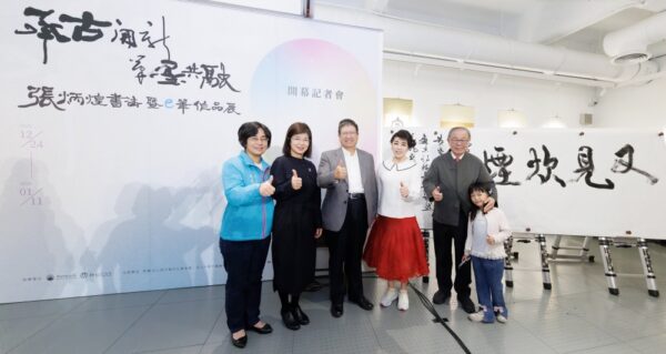 張炳煌教授是臺灣家喻戶曉的書法名家,12/27日在新竹縣政府文化局美術館101展廳舉辦「承古開新、筆墨共融-書法暨e筆作品展」,開場由銅好樂團三重奏揭幕,而與張教授擁有多年深厚友誼的聲樂家簡文秀,特別專程趕赴新竹,高歌一曲〈又見炊煙〉結合張教授的書法揮毫,實為難得一見的跨域藝術聯動!
