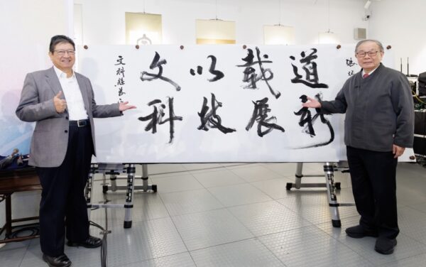 圖:張炳煌教授現場揮毫「文」以載道「科」技展新 感謝新竹縣長楊文科對藝文發展的支持。(圖/億光文化基金會提供)
