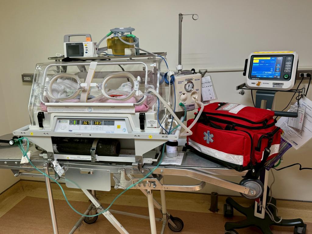 新樓醫院說明,而對於需要更高層級醫療支持新生兒,醫院也有設備齊全、團隊專業新生兒加護病房(NICU),以跨專業整合照護,守護每一個初來乍到小生命;這不僅是醫療照護呈現,更是我們對生命最深承諾;行動NICU,轉送危急新生兒傳送保溫箱,袋子裝的是急救用品及藥品及呼吸器等。