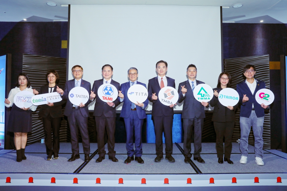 ▲圖第一排由左至右:精密機械研究發展中心周麗蓉副總經理、台灣電子製造設備工業同業公會張雁媜副秘書長、中華民國對外貿易發展協會周秀隆副秘書長、台灣機械工業同業公會莊大立理事長、經濟部國際貿易署劉威亷署長、台灣工具機暨零組件工業同業公會林松益副理事長、臺灣木工機械工業同業公會涂旻聖常務理事、社團法人台灣智慧自動化與機器人協會朱盈勳副秘書長、臺中市機械業二代協進會張為鈞會長。(圖/主辦單位提供)