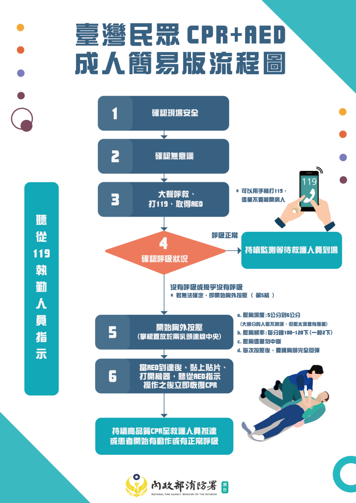 消防局提醒,CPR操作應掌握「用力壓、快快壓、胸回彈、莫中斷」四大原則,按壓深度約5至6公分、速率每分鐘100至120次。確保每次按壓後完全回彈,儘量避免操作中斷。
