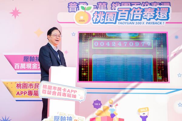 桃園市長張善政9日下午前往桃園區,出席「普發一萬.桃園百倍奉還」壓軸抽獎記者會。張市長表示,本次活動配合中央普發現金一萬元政策,自114年11月12日至12月31日,短短50天內吸引超過8.6萬名註冊會員參與,累計登錄發票逾243萬張,消費金額突破新臺幣20億元,成功串聯桃園在地商圈及觀光工廠,發揮「1加1大於2」的加乘效果,顯著活絡在地經濟。