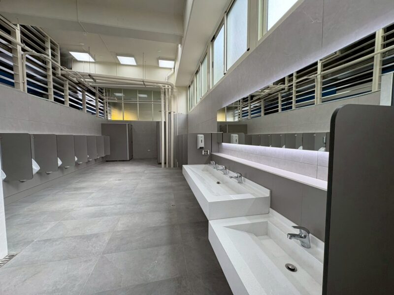 台中市政府運動局 表示,此次廁所優化工程已完成重新配管作業,並同步進行地坪與磁磚全面更新,增設全新衛生設備,同時針對內外牆面進行粉刷,並重新噴漆百葉窗,有效改善過往異味與潮濕問題,提升整體使用品質。